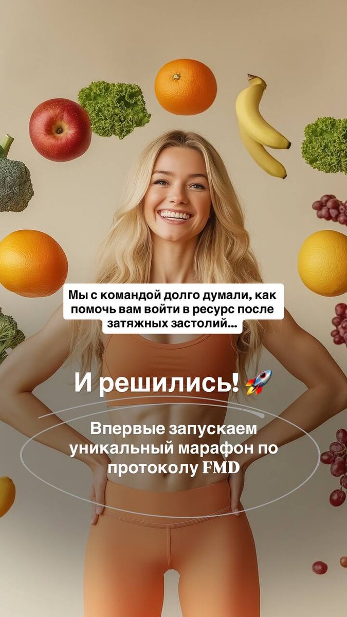 Самое обидное — это «цикл разочарования». Мы худеем к праздникам, чтобы за 3 дня откатиться назад. А потом снова ждать лета? 🔄 Мы с командой долго думали, как помочь вам войти в ресурс после затяжных застолий... И решились! 🚀 Впервые запускаем уникальный марафон по протоколу FMD. Что такое FMD? Если кратко — это «псевдоголодание». Фишка в том, что ваш организм ДУМАЕТ, что вы голодаете (и запускает омоложение клеток), но при этом вы ЕДИТЕ! 🥗 Представляете? Никаких голодных обмороков. Начинаем 9 января! Когда праздничный шум утихнет, и вы будете готовы посвятить время себе. Идеальное время для «обнуления» организма 🌱 Но я не оставлю вас наедине с салатами до 9-го! Ловите мини-гайд «Как выжить в праздники и не прибавить +5 кг» 👉 1️⃣ Двигайтесь! Горки, лыжи, просто прогулка 40 минут — за это ваш метаболизм скажет спасибо ⛸ 2️⃣ Правило тарелки: 1/2 овощей, 1/4 белка, 1/4 углеводы. И никаких «кусочничеств» мандаринками между делом. 🍊🚫 3️⃣ Лайфхак для застолья: 1 бокал