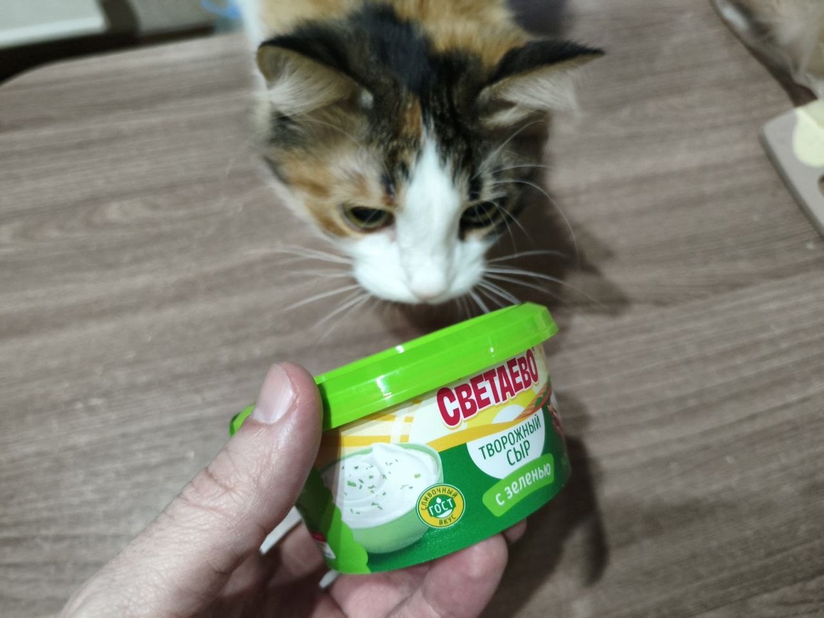 Ничего лишнего — сливочная основа, зелень, аккуратный вкус. Плюс, удобно намазывается. Судя по фото, даже кошка проявила к нему интерес, так что продукт явно привлёк внимание не только моё.