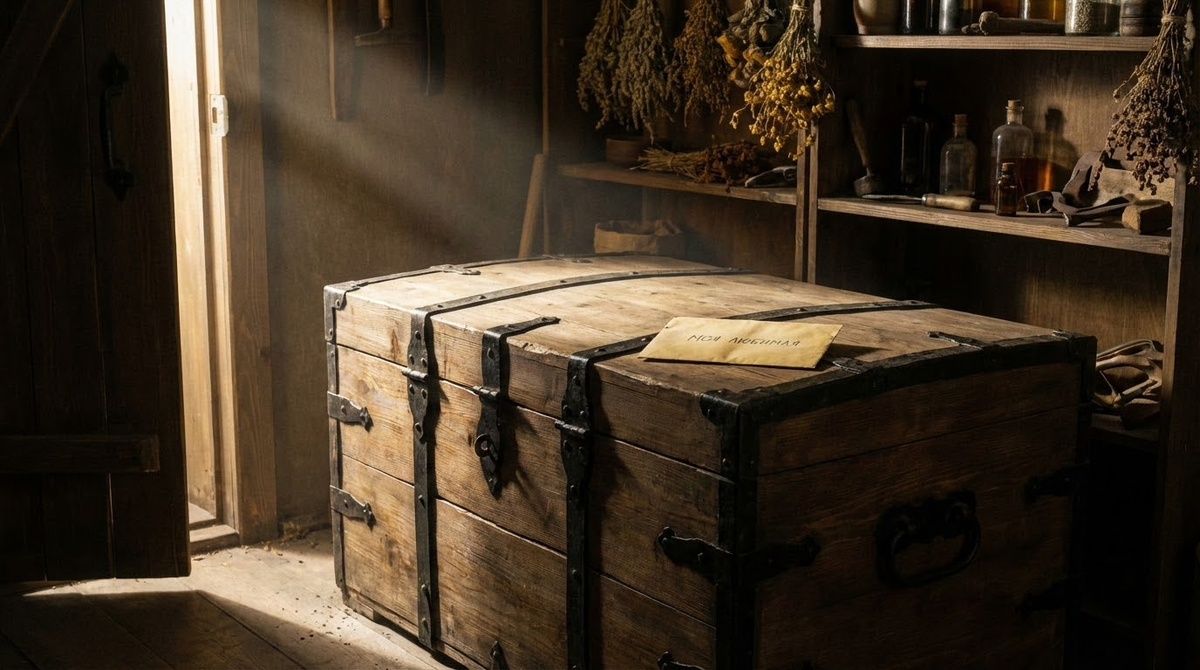 Старый кованый сундук с почерневшими от времени петлями. Вера видела его и раньше – он стоял в углу, накрытый тряпьём. Но сейчас тряпьё было сброшено, а на крышке лежал конверт.