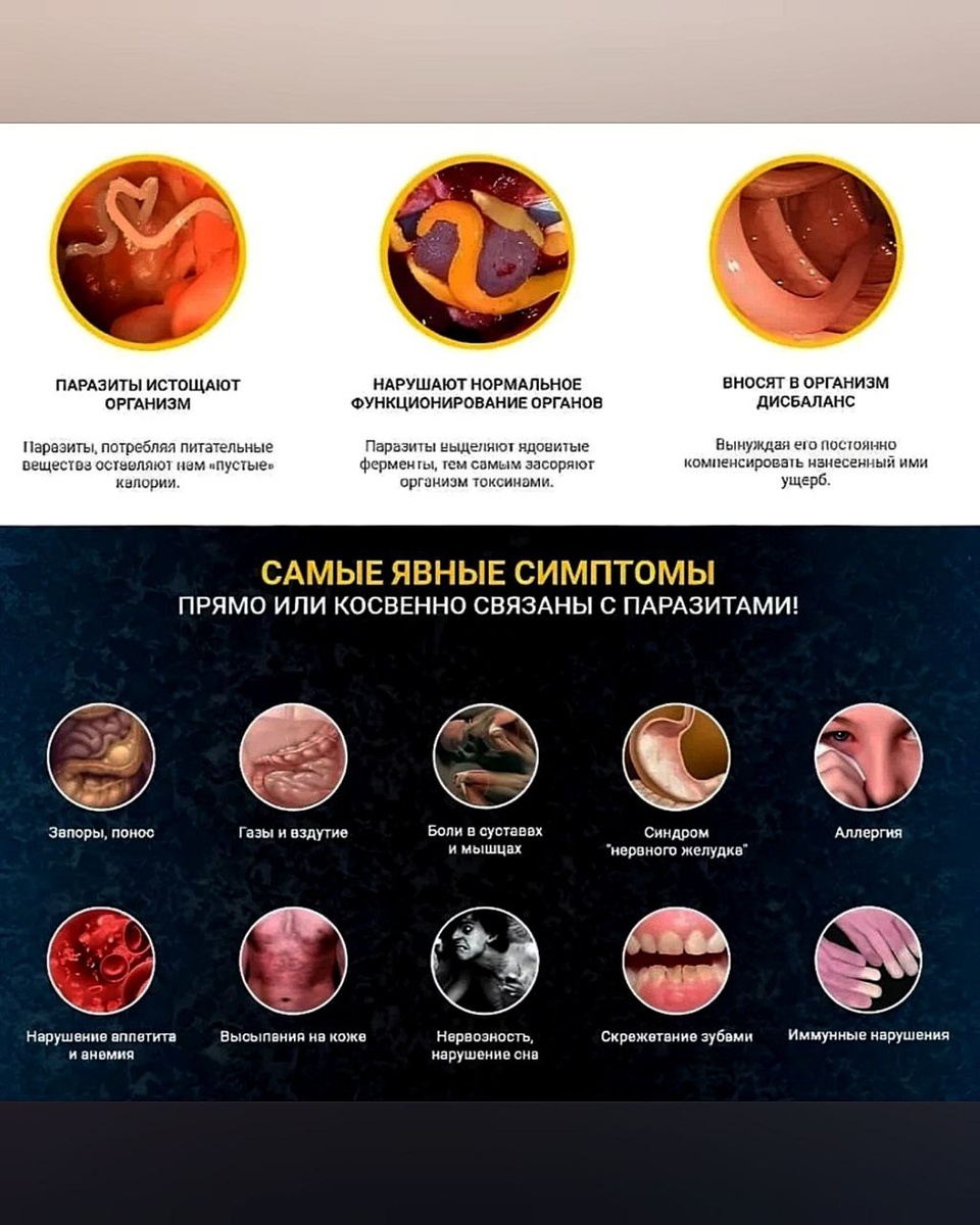 : 1. Проблемы с работой системы пищеварения.✅ Нарушения стула (запоры или диарея), болевые ощущения в брюшной полости, метеоризм, отрыжка, приступы тошноты. 2. Изменение аппетита. Снижение либо Чрезмерное повышение аппетита. 3. Нервные расстройства. Чувство раздражённости, бруксизм (скрипение зубами по ночам), проявления агрессии, проблемы со сном. 4. Воздействие на центральную нервную систему. ✅ Появление судорог, приступов депрессии или гиперактивности. 5. Раздражение в области ануса и половых органов.✅ У девочек возможно развитие вульвовагинита. Ослабление иммунитета. Учащение респираторных заболеваний, повышение вероятности грибковых и гнойничковых поражений кожных покровов и слизистых оболочек. 6. Также паразитозы могут проявляться повышенной температурой, сыпью и другими аллергическими реакциями, железодефицитной анемией.