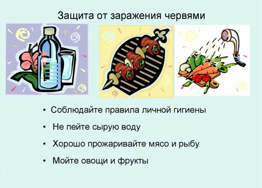 : Соблюдать правила личной гигиены. ✅ Мыть руки перед приёмом пищи, после каждого похода в туалет, после посещения общественных мест и после контакта с животными. Тщательно мыть продукты питания.✅ Фрукты и овощи, зелень и ягоды нужно промывать проточной водой и по мере необходимости замачивать в дезинфицирующих растворах (например, в содовом растворе). Приобретать мясо и рыбу только в местах санкционированной торговли.✅ Тепловая обработка должна составлять: для мяса — не менее 2,5 ч, рыбы — не менее 30 минут. Кипятить воду или употреблять бутилированную воду.✅ Если в доме есть домашние животные, то им необходимо проводить профилактические курсы антипаразитарной терапии.✅ Обеспечивать защиту продуктов питания от насекомых. Например, засетчивать оконные проёмы, накрывать готовые блюда. ✅