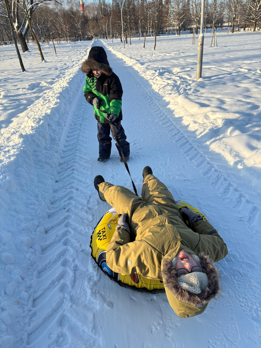 Мороз коварно вмешался в наши планы с Майей по выгуливанию детей в Парке Авиаторов. Но мы всё равно реализовали задуманное, хоть и недолго. И забавно, что пострадали от мороза только взрослые. Разгоряченным от зимних забав с ватрушкой детям суровые питерские минус 16 явно были не помехой.