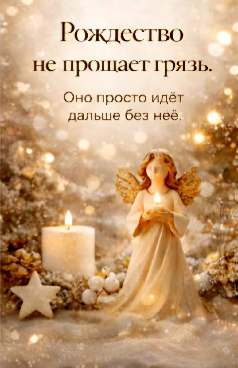 Оно просто идёт дальше без неё." Есть моменты в году, когда всё становится кристально честно. Рождество — один из них. Это время чистоты: чистоты Души, Духа, помыслов, намерений. И сейчас очень важно задать себе вопрос: а действительно ли вы живёте и действуете из чистоты? Или говорите слова, которые не совпадают с тем, что хочет ваша Душа? Делаете шаги, которые утяжеляют, а не наполняют? Когда это происходит — внутри уже есть сбой. Накопленная тьма, тяжесть, программы, подключки, чужие ожидания начинают управлять человеком. Рождество не наказывает. Оно "не берёт дальше" тех, кто не готов к чистоте. Именно поэтому сейчас так важно: 🎯очистить тело и энергетику 🎯отпустить утяжеляющие состояния 🎯вернуть себе ясность, здоровье, финансовый поток 🎯вспомнить, чего на самом деле хочет ваша Душа Если вы уже умеете работать с собой — сделайте себе сеанс. Вы почувствуете, как возвращаетесь в себя, словно из места, куда вас выбросило. Если не умеете или Вам нужна Глубина, больше че