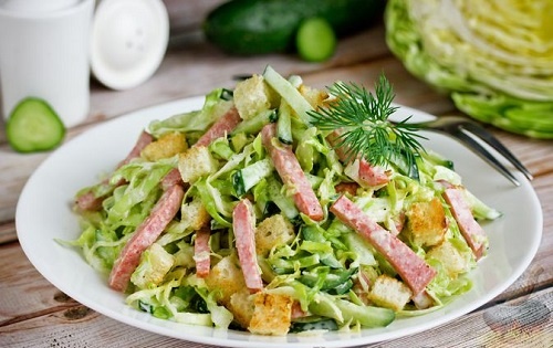 Пекинка «дружит» с множеством иных овощей. Для мясоедов найдутся рецепты с колбасой, курицей. Изысканные кушанья получатся, если добавить в состав морепродукты, крабовые палочки. Это дает хозяйкам возможность пофантазировать и составить свой вариант закуски.