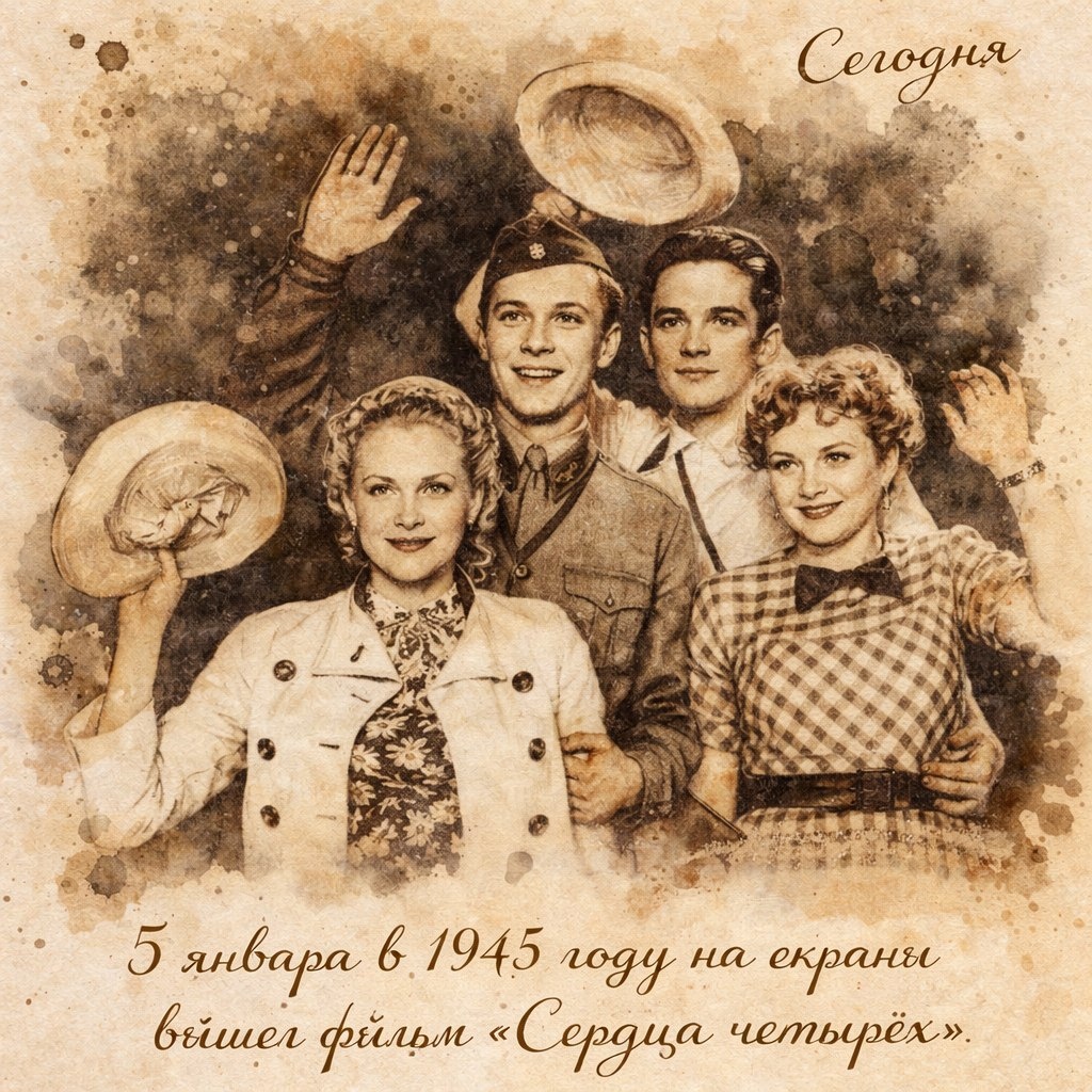 5 января 1945 года — дата, которая вошла в историю советского кино. В этот день в прокат вышла лирическая комедия «Сердца четырёх», ставшая для зрителей глотком свежего воздуха на излёте Великой Отечественной войны. Фильм был снят ещё в 1941 году режиссёром Константином Юдиным на студии «Мосфильм». Сценарий написали Алексей Файко и Анатолий Гранберг. Уже 20 февраля 1941‑го худсовет киностудии высоко оценил картину, назвав её «бесспорной художественной удачей». Однако судьба фильма оказалась непростой. В мае 1941 года секретарь ЦК ВКП(б) Андрей Жданов подверг ленту резкой критике за «отрыв от действительности». В постановлении Секретариата ЦК ВКП(б) от 26 мая 1941 года говорилось: «Отметить, что кинофильм „Сердца четырёх“… неправильно отображает советскую действительность, изображая жизнь советских людей как праздное, легкомысленное времяпровождение. Кинофильм „Сердца четырёх“ к выпуску на экран запретить». Картина пролежала на полке пять лет. Лишь в декабре 1944 года, когда победа был