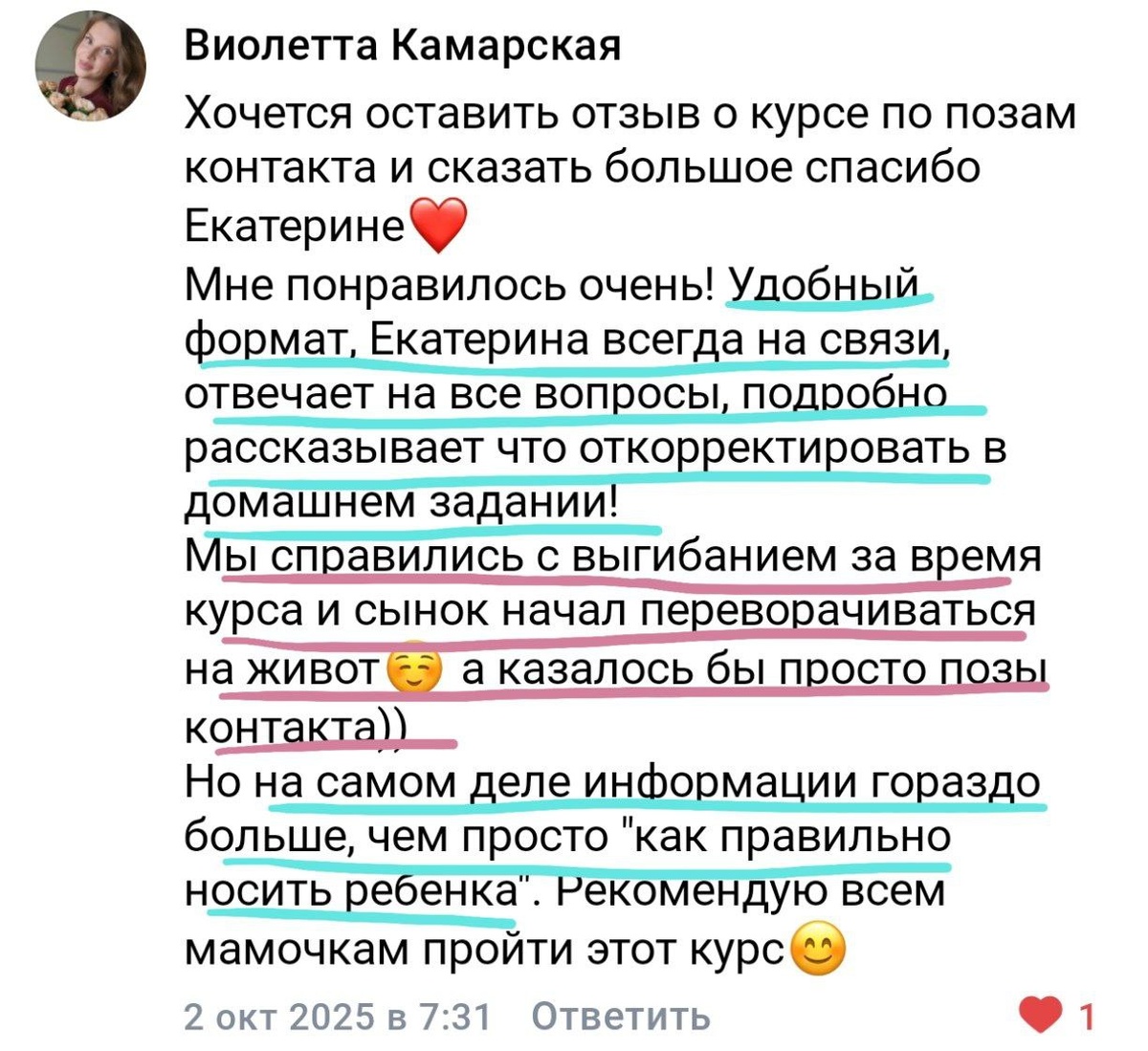 Помимо навыка правильно носить на руках на курсе мы также решаем множество вопросов👇👇👇 ✔️Уверенность мамы в себе и своих действиях ✔️Двигательные навыки малыша: перевороты уже во время курса, удержание головы и многое другое ✔️Решаем вопросы выгибания, асимметрии 🌈 Мамы советуют курс своим беременным подругам и молодым родителям Потому что я лично, без кураторов: ⭐️Внимательно проверяю каждое домашнее задание ⭐️Даю подробную обратную связь ⭐️Веду до победного результата ⭐️Иду навстречу по срокам, когда малыш или мама болеют ➖➖➖ ⭐️Старт потока 17/01 ⭐️Скидки на участие действуют до 12/01 для всех, до 17/01 для участников клуба ⭐️Условия, стоимость, запись https://taplink.cc/rutschool/p/handling/ ⭐️Комната ожидания курса, когда хочешь дождаться потока или еще не уверен в своем решении https://t.me/+2udgTuC1fXszYjky ▪️Внимание! Мошенники https://dzen.ru/media/rutschool/bot-kotoryi-prinimaet-zaiavki-na-uchastie-v-kurse-pozy-kontakta-nachal-prinimat-oplatu-za-uchastie-v-kurse-695a380
