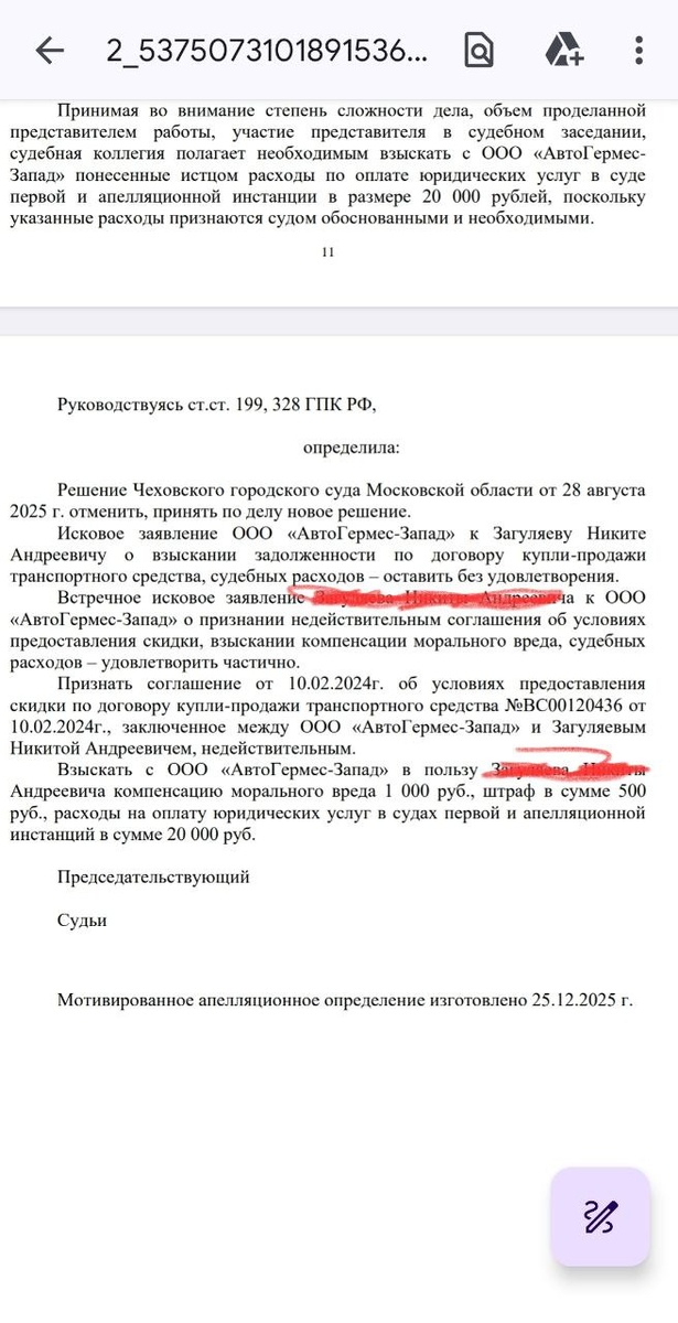 Отменили решение суда первой инстанции о взыскании скидки, признали доп соглашение о скидке недействительными и взыскали судебные издержки. Консультации по телефону +79177721744.