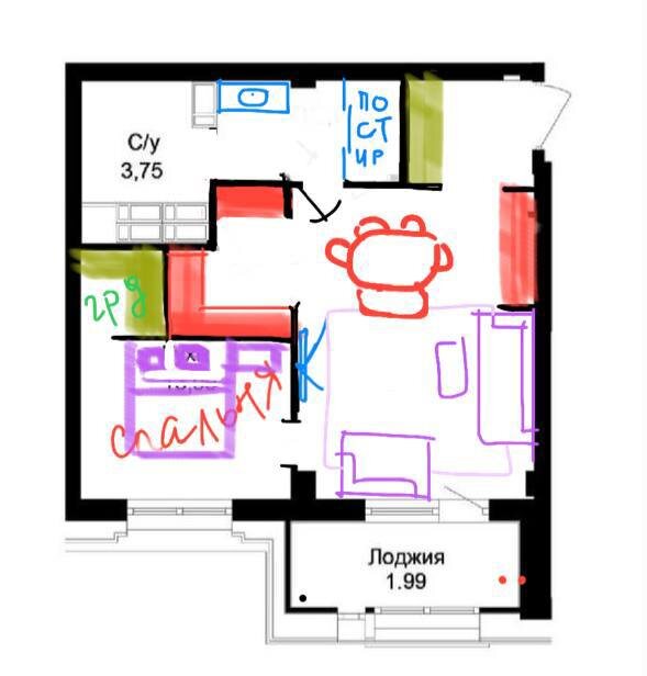 : Несколько раз сказано про гостей, соответственно гости важные, неотъемлемая часть жизни. Слова о том, что спальня можно даже без окна, ещё раз намекают на то что принципиально важно кухня гостиная большая. Это и прямым текстом есть, но и усиление в виде этих деталей указывают на этот запрос. Не переносить мокрую точку довольно непросто, если хочется сделать объединённую кухню в гостиную большую. Имеет лучшее, конечно хотелось бы на лоджию иметь выход из кухни гостиной. Санузел очень маленький и вход в него из единственно возможного места. Все окружено вентиляционными коробами. Из 47 м² 10,2- коридор. Это больше 20%. Катастрофическим много с одной стороны. Большой потенциал – с другой стороны. Ты какая часть кухни и коридора присоединить к объединённой кухне гостиной. При этом мокрую точку переносим несильно, в левом верхнем углу, где была кухня, делаем гардеробную небольшую пресс спальной комнате. Спальню комнату переносим в кухню. Спальня будет небольшая, но у меня нет точных