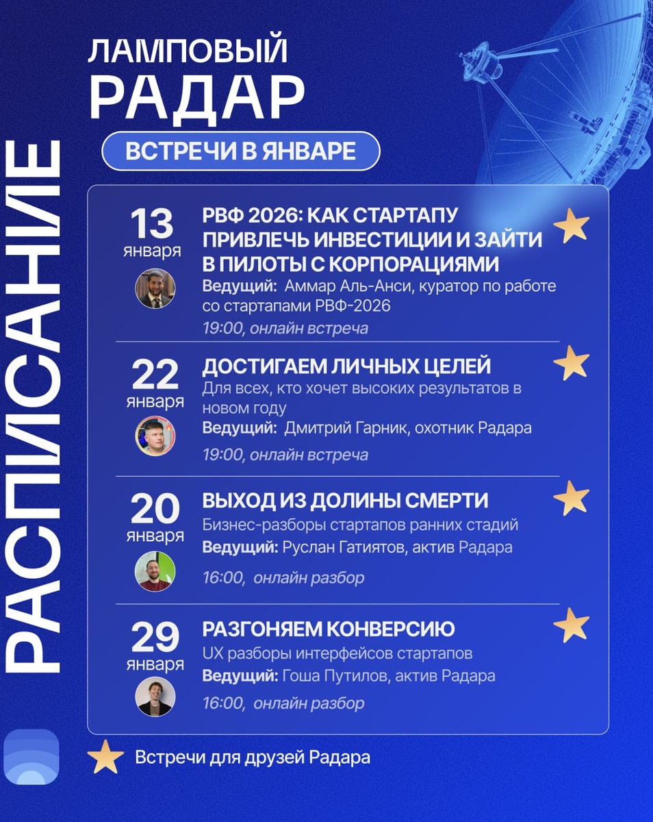 🖥 Онлайн-встречи для Друзей Получить доступ в наше закрытое сообщество и возможность ходить на эфиры можно по ссылке: 🏅productradar.ru/friends🏅 🔴«РВФ 2026: как стартапу привлечь инвестиции и зайти в пилоты с корпорациями» 13 января, 19:00 (МСК) Ведущий: Аммар Аль-Анси, куратор по работе со стартапами РВФ-2026 🔴«Достигаем личных целей» Для всех кто, кто хочет высоких результатов в новом году. 22 января, 19:00 (МСК) Ведущий: Дмитрий Гарник Охотник, 20 лет в IT: последние 10 лет занимаюсь B2C приложениями. Co-основатель Simpler: 20 МЛН установок. 🔴«Выход из долины смерти» Разборы стартапов ранних стадий 20 января 16:00 - 18:00 (МСК) Бизнес-разборы стартапов на ранних стадиях, поиск точек роста, свежий взгляд на свой маркетинг и структурирование продвижения проекта. Мы вместе ищем рабочие гипотезы и каналы, чтобы ваш проект быстрее набрал обороты. Ведущий: Руслан Гатиятов, основатель Глабикс. 13 лет занимаюсь Web & Mobile заказной разработкой. Кандидат физмат наук. Амбассадор