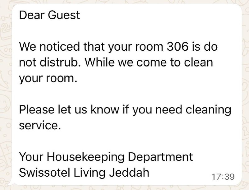 Мы вернулись в номер около 14 часов. Номер убран не был. Мы включили DND и я принялся писать вчерашний пост. К вечеру получаю такое сообщение в мессенджер. Уважаемый гость, Нами зафиксирован статус «не беспокоить» в вашем номере 306, когда мы приходили для уборки. Пожалуйста, сообщите нам, если вам требуется уборка. Ваш департамент хаускипинга Не важно автоматизировано ли это сообщение или написано индивидуально, важен сам факт, что работа хаускипинга не заканчивается при виде DND. И это тот самый пример, который стоит взять на заметку.