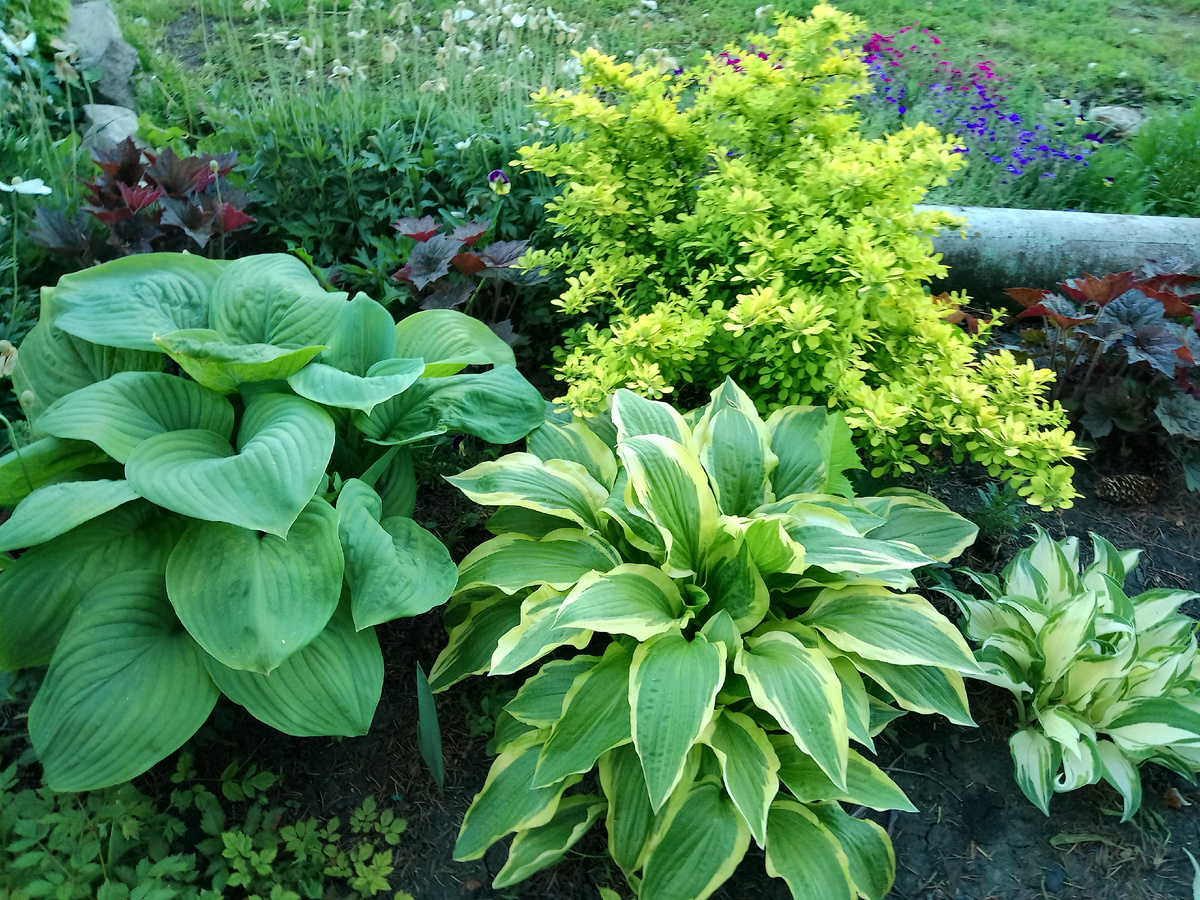 На фото всё хосты от Тани (ЖЗЖ) , почти целый день солнце, листья подгорают только у зелёной.
