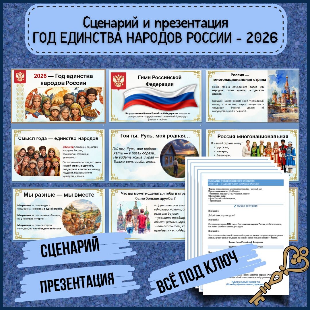 2026 год объявлен Годом единства народов России — это важное событие для системы образования, воспитательной работы и патриотического просвещения детей и подростков. Перед педагогами стоит задача не просто рассказать о многонациональности нашей страны, а показать ценность дружбы, уважения культур и общего исторического пути в понятной и живой форме. Именно поэтому особенно востребованы готовые методические решения, которые можно сразу использовать в работе: сценарии, презентации, наглядные материалы и творческие задания для детей. Представляем комплект для проведения мероприятий, посвящённых Году единства народов России, который подходит для: В комплект входят: Готовый сценарий торжественного открытия Года единства народов России сопровождается визуальной презентацией. Материал помогает: Подходит для школьных линеек, классных часов, актовых залов. 👉 Скачать сценарий и презентацию можно здесь: