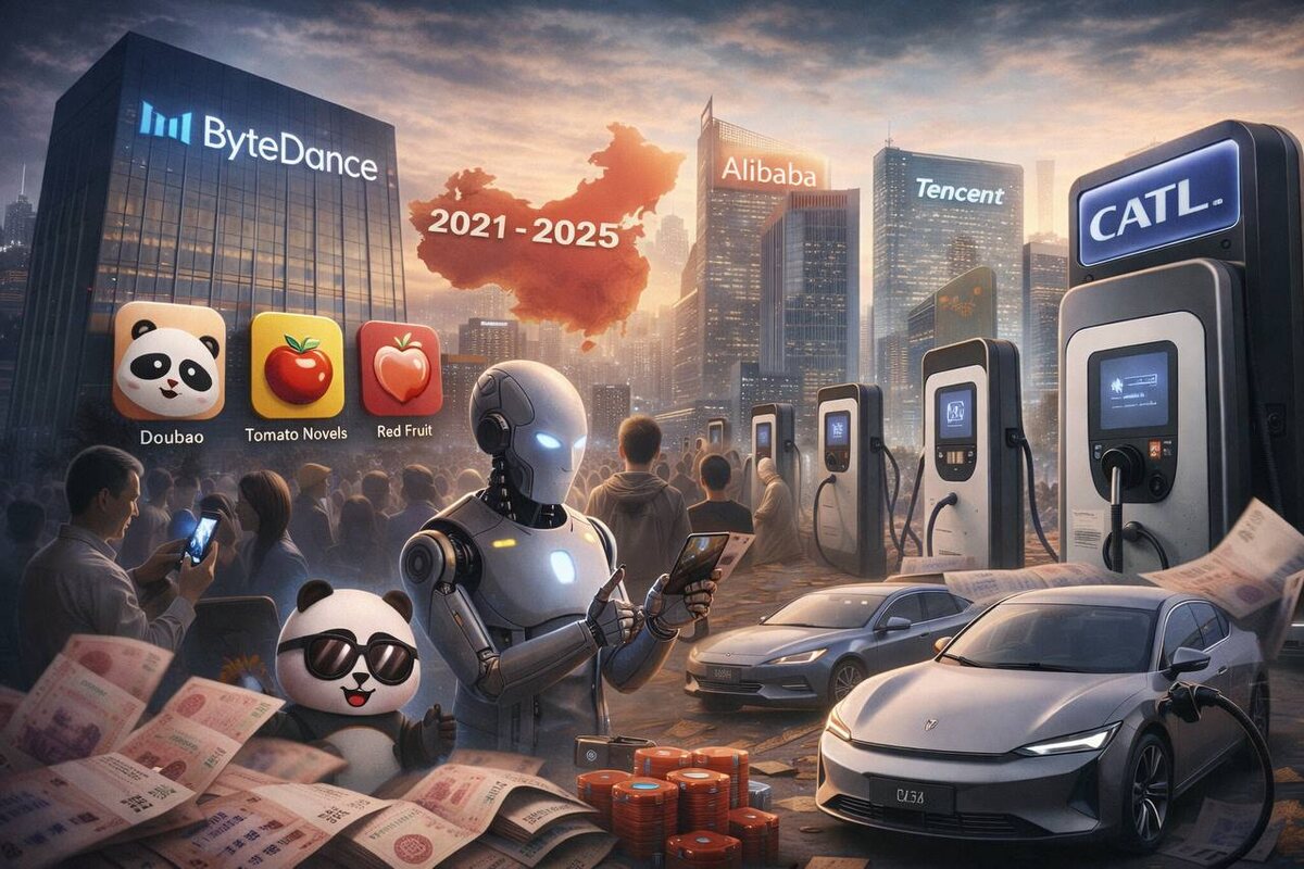 LatePost выкатил «Пятилетний обзор» — и если коротко, за 2021–2025 годы Китай сильно переформатировал свою экономику, технологии и рынки. Причём не через резкие революции, а через системное давление крупных игроков. Главный герой этого периода — ByteDance. По факту именно он стал тем самым фактором, который больше всего изменил интернет-ландшафт Китая. Все приложения, которые за последние пять лет смогли перевалить за 100 миллионов ежедневных пользователей, принадлежат ByteDance. Tomato Novels, Red Fruit, Doubao — это не разовые удачи, а выстроенная фабрика массовых продуктов. И это важный сдвиг: рост больше не случайность, а результат архитектуры. В ИИ Китай пошёл своим путём. В отличие от США, где ИИ чаще продаётся как инструмент для работы, эффективности и бизнеса, китайские приложения делают ставку на повседневную жизнь и развлечения. Чаты, помощники, контент, «поиграться» — и только потом productivity. В сумме все китайские ИИ-приложения уже перевалили за 100 миллионов ежедневны