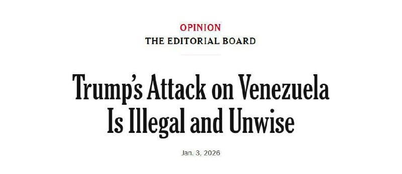 ". Газета проводит параллели с вторжением США в Ирак, Афганистан и ударами по Ливии, которые не привели к улучшению ситуации в этих странах. "Однако, если и есть какой-то главный урок американской внешней политики за прошедшее столетие, то это то, что попытка свергнуть даже самый отвратительный режим может только усугубить ситуацию. Соединенные Штаты потратили 20 лет, не сумев создать стабильное правительство в Афганистане, и заменили диктатуру в Ливии расколотым государством. Трагические последствия войны 2003 года в Ираке продолжают преследовать Америку и Ближний Восток. Возможно, наиболее показательным является то, что Соединенные Штаты периодически дестабилизировали страны Латинской Америки, включая Чили, Кубу, Гватемалу и Никарагуа, пытаясь свергнуть правительство силой", - заявляет NYT. Кроме этого, газета отмечает что Трамп не провел свои действия через Конгресс, как того требует Конституция США. "Господин Трамп до сих пор не предложил внятного объяснения своим действиям в В