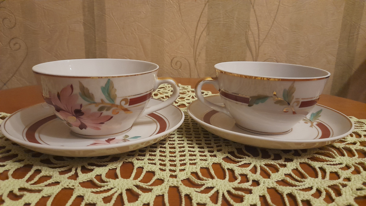 Довбышский фарфоровый завод был основан в 1823 году польским помещиком Пшебельским в посёлке Довбыш (Житомирской, в то время, видимо, губернии) после того, как в этих местах открыли крупнейшее на Украине месторождение каолиновой глины. После революции завод был национализирован, и в разное время носил имена разных революционеров. После ВОВ фарфоровый завод стал называться Довбышским. В 60-е годы визитной карточкой завода стала кобальтовая посуда, декорированная позолотой. Она составляла до 40% выпускаемой продукции. После провозглашения независимости Украины предприятие с той или иной формой собственности просуществовало до 2024 года. Моё знакомство с продукцией этого завода началось вот с этих 2-х чайных пар, которые я, увидев на Авито, сразу захотела приобрести. Чем они так меня покорили? Не знаю, может быть каким-то совсем несовременным дизайном. А когда я их получила, они понравились мне ещё больше. Тончайший фарфор. Держишь в руке и совсем не ощущаешь их веса. Давайте посмотрим н