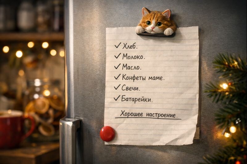 На холодильнике висел листок, прилепленный магнитом с котом. Листок был исписан её почерком — мелко, в столбик, с галочками напротив того, что уже сделано.