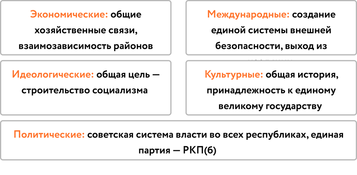 Нельзя также забывать, что все эти республики были совсем недавно частями единого великого государства — Российской империи. Их объединяла многовековая история и менталитет, основанный на общей исторической памяти. Кроме того, во всех республиках проживало русское население, и русская культура оказывала влияние на культурную жизнь других национальностей. Таким образом, для объединения советских республик существовали различные объективные предпосылки.