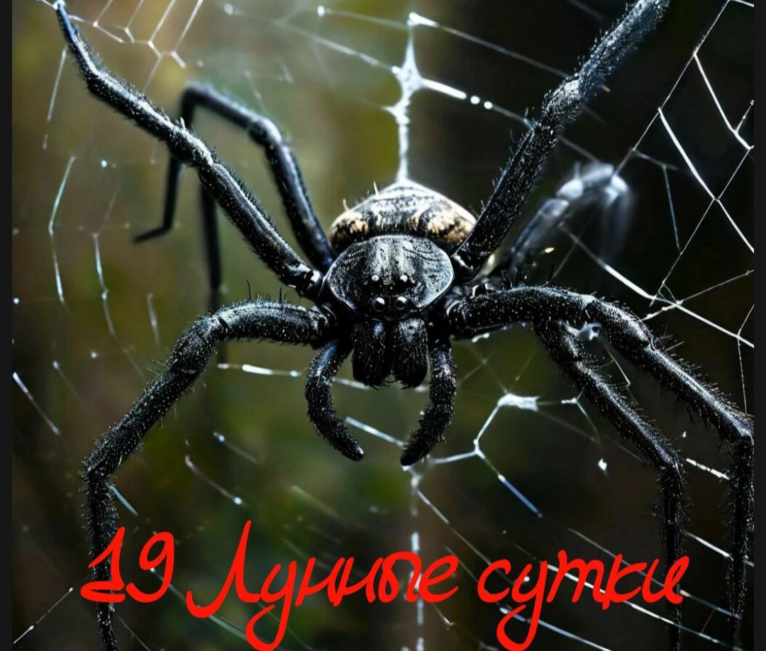 До 21 : 22 продолжаются 18 Лунные сутки 19 Лунные сутки Начнутся в 21:22 Убывающая Луна во Льве «ПАУК" В 19 Лунные сутки открываются каналы, связывающие нас с прошлым. День призывает оглянуться назад, вспомнить с кем мы были несправедливы, кто причинил боль нам. Постараться простить своих обидчиков и попросить прощения у обиженных. Это особый день, когда легче чем в другие дни, избавиться от накопившихся негативных эмоций. В 19 Лунные сутки энергетика тяжёлая и неблагоприятная. Велика опасность угодить в ловушку-поддаться дурману, наваждению, ошибиться, запутаться, попасть под чужое влияние.