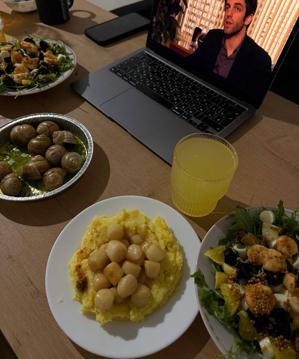 Горячее - просто пюре с жареными гребешками и салат с креветками 😍