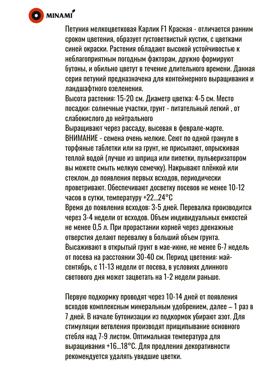 Minami seeds Петуния мелкоцветковая Карлик F1 Красная - отличается ранним сроком цветения, образует густоветвистый кустик, с цветками синей окраски. Растения обладают высокой устойчивостью к неблагоприятным погодным факторам, дружно формируют бутоны, и обильно цветут в течение длительного времени. Данная серия петуний предназначена для контейнерного выращивания и ландшафтного озеленения. Высота растения: 15-20 см. Диаметр цветка: 4-5 см. Место посадки: солнечные участки, грунт - питательный легкий , от слабокислого до нейтрального