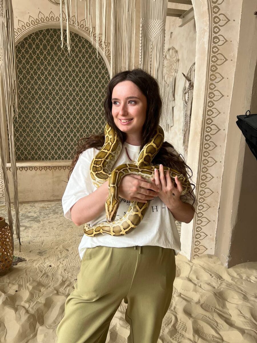 Наша героиня, которая летела из другой страны ради этой съемки, готова поменять концепцию и посниматься в готическом образе с черными розами. Роз тоже нет)) все доставки готовы их привезти… через неделю. Я по пути покупаю баллончик черной краски — будем значит красить какие есть. Маша не сдается и звонит по авито. Мы садимся краситься. И змея для нас нашлась! К нам приехала чудесная питониха (так можно сказать?) Василиса, а ее хозяин не отходил от нас ни на минуту, со всем помогал и подсказывал, рассказывал интересные факты о змеях. В частности, обычно змеи совсем не интересуются людьми — мы им непонятны как категория: для еды слишком крупные, но и не хищники, угрозы не представляем. Они видят нас как большое теплое дерево. Теплое змеям нравится. ✨У владельца Василисы не одна змея, но если остальные его не узнают и никак не выделяют среди других людей, то с Василисой у них сформировалась некая связь: она если не считает его хозяином, то как минимум отличает от других людей. И если он