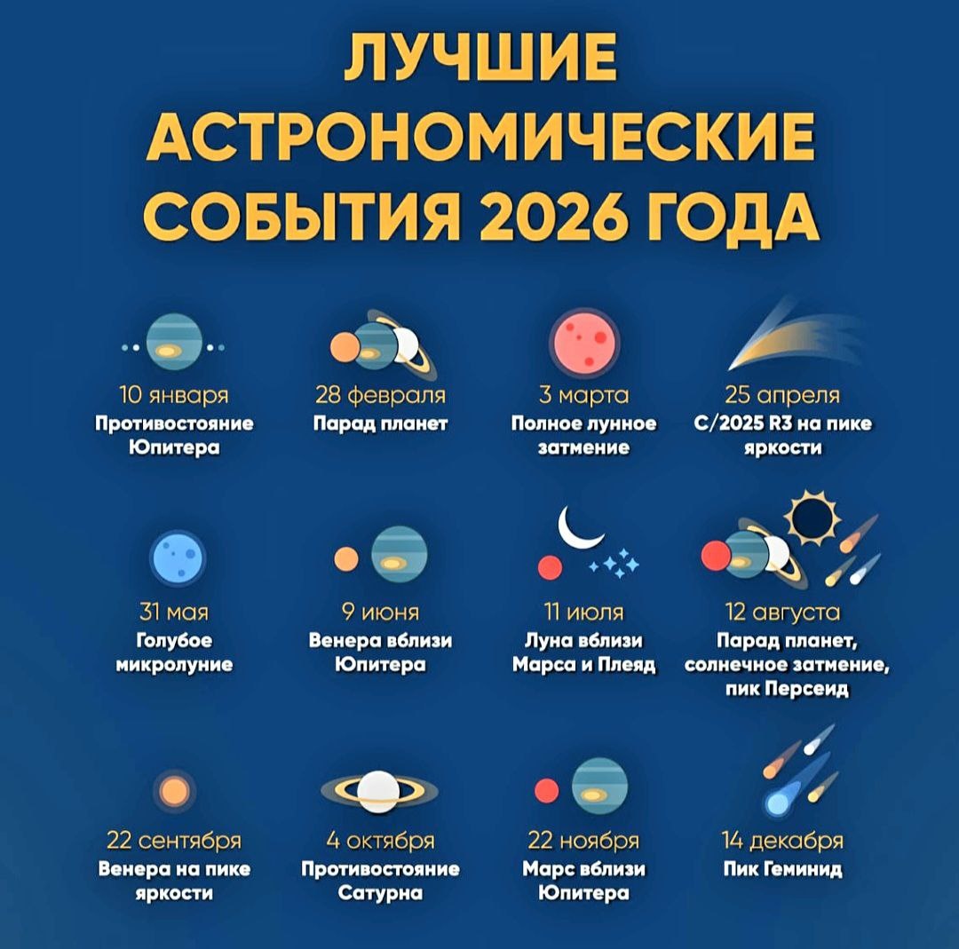 🔹10 января - Юпитер окажется точно напротив Солнца на небе, если смотреть с Земли. Он будет иметь максимальную яркость и его легко можно будет увидеть невооруженным глазом 🔹28 февраля - шесть планет — Юпитер, Уран, Сатурн, Нептун, Венера и Меркурий — выстроятся на небе. Планеты можно будет увидеть после заката низко над западным горизонтом. Юпитер, Сатурн, Венеру и Меркурий - наблюдать невооруженным глазом, а в бинокль или небольшой телескоп можно найти Уран и Нептун. 🔹3 марта - Луна окрасится в красный цвет во время полного лунного затмения, которое можно будет наблюдать на востоке России. 🔹25 апреля - Комета C/2025 R3 (PANSTARRS) достигнет максимальной яркости и её можно будет увидеть в бинокль. Возможно, это самая яркая комета 2026 года. 🔹31 мая - В ночном небе можно появится Голубая Луна. В момент второго полнолуния наш естественный спутник будет находиться в созвездии Скорпиона. 🔹9 июня- Венера и Юпитер – две самые яркие планеты на небе окажутся очень близко друг к другу и