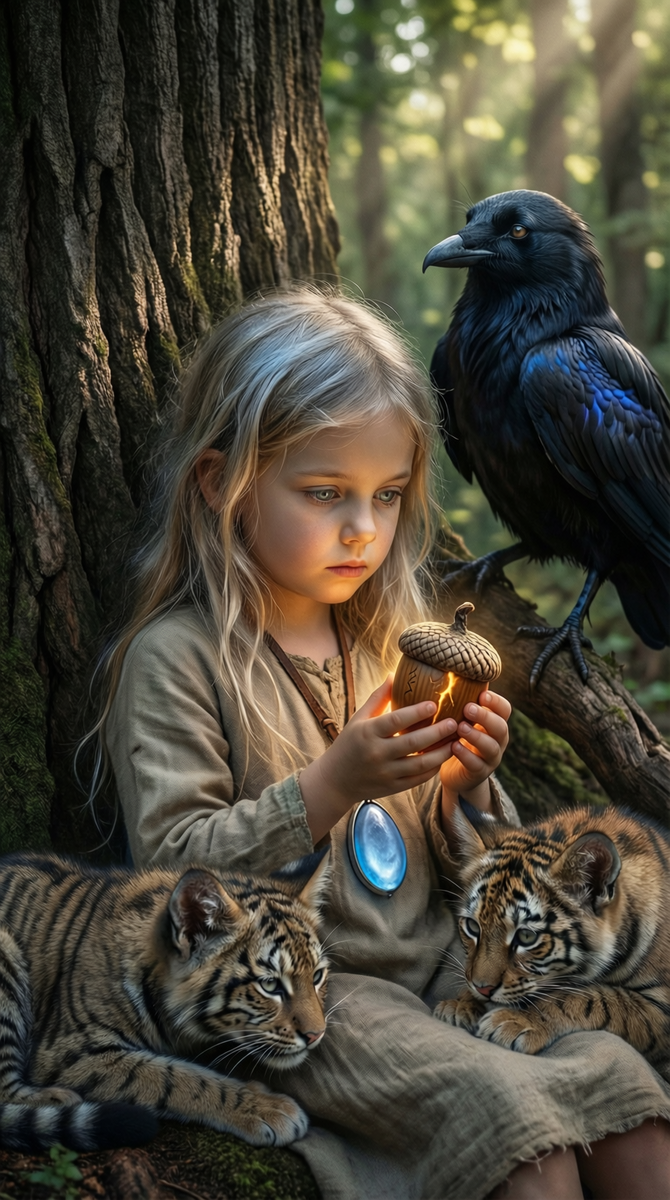 Заря не плакала в первой своей жизни, наступившей весны. Она молчала, не как испуганный зверёк, а как озеро перед рассветом: спокойное, полное тайн, готовое отразить небо, едва оно прикоснётся. Богдана часто сидела с ней у порога, когда снег ещё лежал под соснами, но в воздухе уже шевелилось что-то новое, не тепло, нет, а обещание тепла. Девочка лежала на меховой подстилке, завёрнутая в шкуру бобра, подаренного старым охотником, что однажды заблудился в Урочище и вышел из него с пустыми руками, но с душой, наполненной страхом и уважением. Зорич не носил её на руках часто. Он знал: руки отца, не колыбель, а ограда. Он стоял рядом. Иногда, прямо у порога, опираясь спиной на косяк, глядя на дочь так, будто каждый её вдох, это молитва, а он, её хранитель. Но однажды, в день, когда с крыши начал капать первый настоящий весенний дождь, и капли падали в лужу под окном, как звоночки, Заря вдруг улыбнулась. Не случайно. Не по-детски. А целенаправленно, как будто увидела кого-то. Богдана обернулась. На ветке ольхи, промокшей от дождя, сидел Ворон. Он не каркал. Он просто смотрел. А в его глазах, чёрных, как смоль, отражалась маленькая девочка — и в этом отражении было что-то древнее. Она его видит, тихо сказала Богдана. Зорич подошёл, опустился на корточки. Кого? Его. Ворона. Не как птицу. А как… собеседника. И точно, Заря тянула ручонку к ветке, не плача, не крича, а зовя. Ворон спрыгнул с ветки. Подошел по земле, ближе. Остановился в трёх шагах. Заря засмеялась, тонко, как колокольчик под ветром. Тогда Ворон кивнул, по человечески, будто поклонился и улетел. А Заря глубоко вздохнула. А от разлуки. Она чувствует, прошептал Зорич. Чувствует, что он, не гость, а страж. С того дня Ворон стал прилетать каждое утро. Он не садился в избе. Он ждал у сосны. И каждый раз, как только Зарю выносили на воздух, он слетал с ветки и пел, не каркал, а именно пел: тихо, ритмично, как будто учил её чему-то. Бабка Агафья, пришедшая проверить мать и дитя, задумчиво покачала головой: Такие дети… они не учатся говорить. Они вспоминают, как слушать. Первый шаг, не на ногах, а в сознании, Заря пошла в семь месяцев. Не по земле, нет. По границе. Однажды Богдана оставила её спать у очага что топили летом на улице. Вернулась а люльки нет. Паника сжала сердце. Но тут из-за бревна, где дрова были сложены, выглянула лапа, огромная, бурая, пушистая. Медвежонок, один из тех, что Зорич спас после гибели матери, осторожно, как нянька, вывел Зарю на свет. Она сидела верхом на его спине, держась за уши, и смеялась. Медвежонок, теперь уже почти взрослый, не шёл, а почти полз, очень осторожно, чтобы удержать на себе ребенка. Однажды уже в конце лета, Зорич нашёл их у ручья. Она попросила, сказал он Богдане, не удивляясь. Не словами. Но я понял. Попросила чего? Увидеть воду. И правда — Заря тянулась к ручью, а вода, странно, не текла мимо, как обычно, а как будто замедлила ход, будто тоже хотела посмотреть на неё. А немного ранее, в ту же весну, Заря впервые поговорила. Не с людьми.С ветром. Она стояла босиком на мху, в рубашонке из льна, и вдруг подняла руки, не как ребёнок, а как жрица. Ветер обвил её, поднял волосы, и она произнесла: «Ты принёс мне запах тополя. Зачем?» Богдана, стоявшая в тени, ахнула. Откуда она знает тополь? Мы же в еловом бору! Но Зорич лишь пожал плечами: Тополь растёт за рекой. Ветер сегодня с юга. Он рассказал ей. Так начался её я