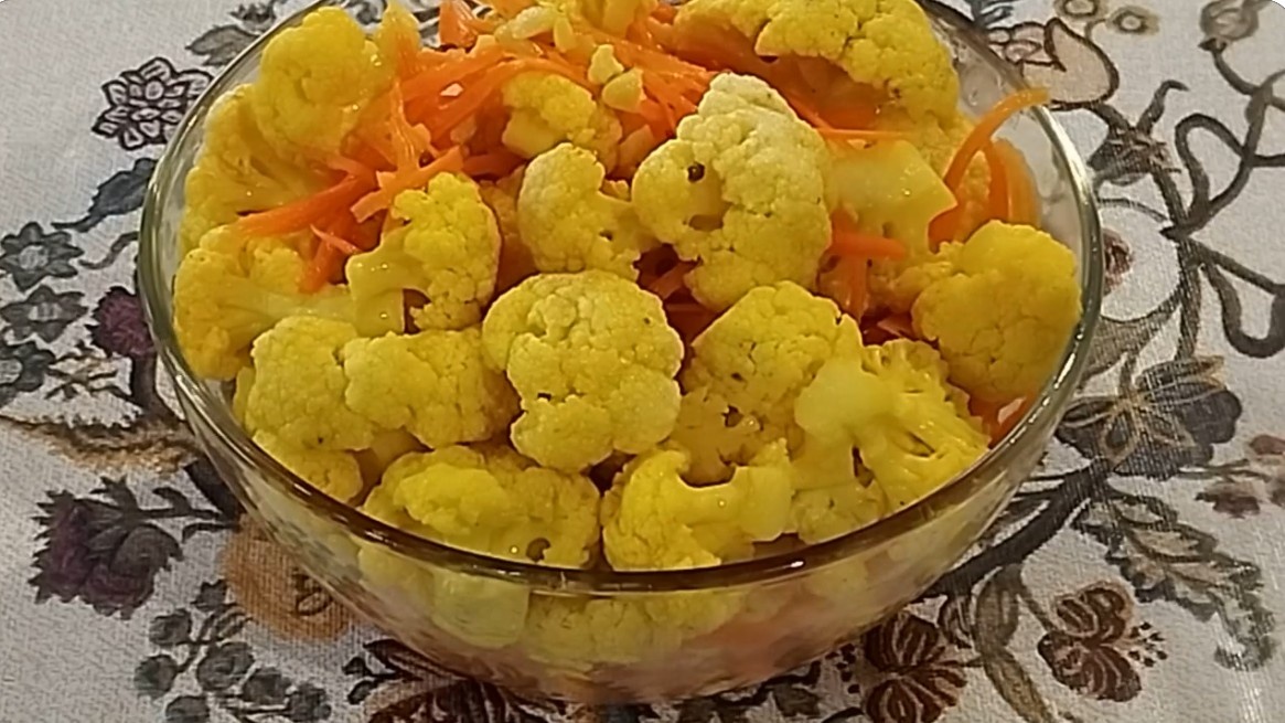 Салат из цветной капусты по-корейски — пикантная закуска, которая может не входить в традиционную корейскую кухню. Однако существуют рецепты с яблочным уксусом, имбирем и другими специями. **Классический рецепт** **Ингредиенты:** - цветная капуста — 600 г; - морковь — 1 шт.; - красный лук — ½ шт.; - болгарский перец — 1 шт.; - острый перец чили — 1 шт.; - чеснок — 2 зубчика; - кориандр — ½ ст. л.; - сладкая паприка (хлопья) — ½ ст. л.; - чёрный перец — ½ ч. л.; - уксус 6% — 1,5 ст. л.; - соль — 1 ч. л.; - сахар — 1 ст. л.; - подсолнечное масло — 5 ст. л. **Приготовление:** 1. Разделите цветную капусту на маленькие соцветия. 2. Отварите их в подсоленной воде (1 ст. л. соли на литр) 3 минуты. Переложите в ледяную воду, чтобы сохранить хруст. 3. В миске смешайте капусту с нарезанными овощами, специями, уксусом, солью и сахаром. 4. Разогрейте масло и залейте им салат. 5. Поставьте в холодильник на сутки. Периодически перемешивайте и пробуйте на соль.