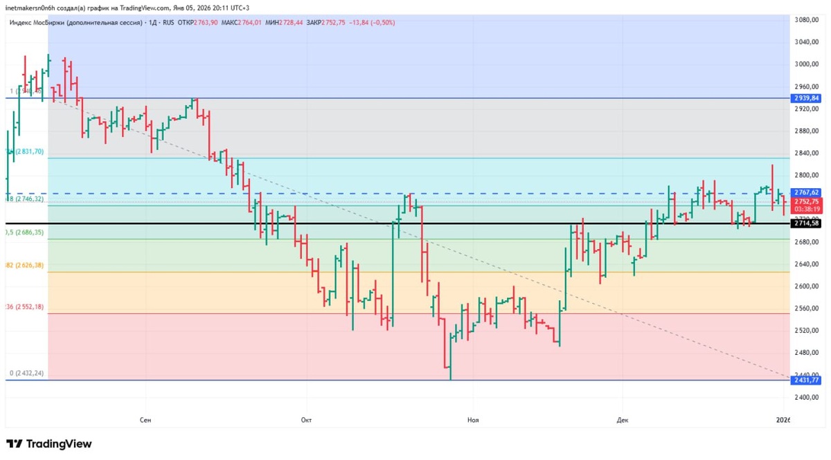 ❗️5 января российский фондовый рынок показал снижение, индекс МосБиржи подешевел на 0,34% до уровня 2757,09