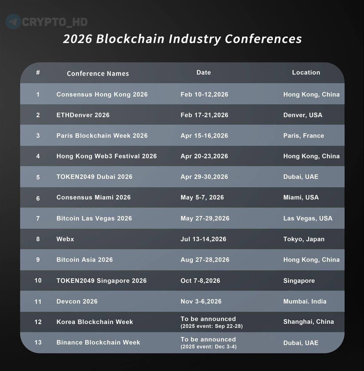 : ➥ Consensus Hong Kong: 10-12 февраля. ➥ ETHDenver: 17-21 февраля. ➥ Paris Blockchain Week: 15-16 апреля. ➥ Hong Kong Web3 Festival: 20-23 апреля. ➥ TOKEN2049 Dubai: 29-30 апреля. ➥ Consensus Miami: 5-7 мая. ➥ Bitcoin Las Vegas: 27-29 мая. ➥ Webx: 13-14 июля. ➥ Bitcoin Asia: 27-28 августа. ➥ TOKEN2049 Singapore: 7-8 октября. ➥ Devcon: 3-6 ноября. ➥ Korea Blockchain Week: даты пока нет. ➥ Binance Blockchain Week: даты пока нет. Crypto Headlines