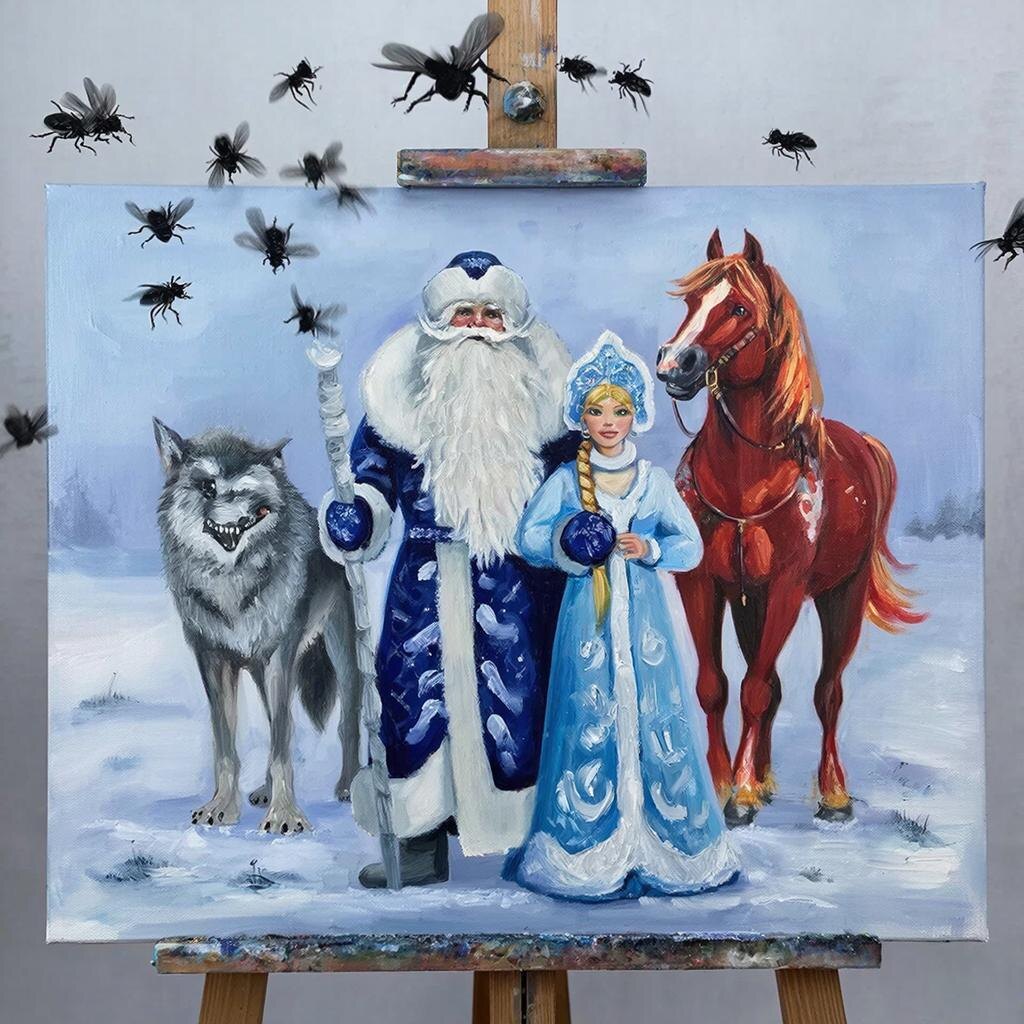 Но чудо произошло неожиданно. Как только насекомые приблизились к картине, фигуры начали двигаться. Дед Мороз встал, величественно поднял свою палочку, создавая вокруг себя защитное сияние. Рядом встала юная Снегурочка, размахивая снежинками, отпугивающими насекомых. Огненная Лошадь заржала громко, подняв копыта и опаляя крылья назойливых существ пламенем.