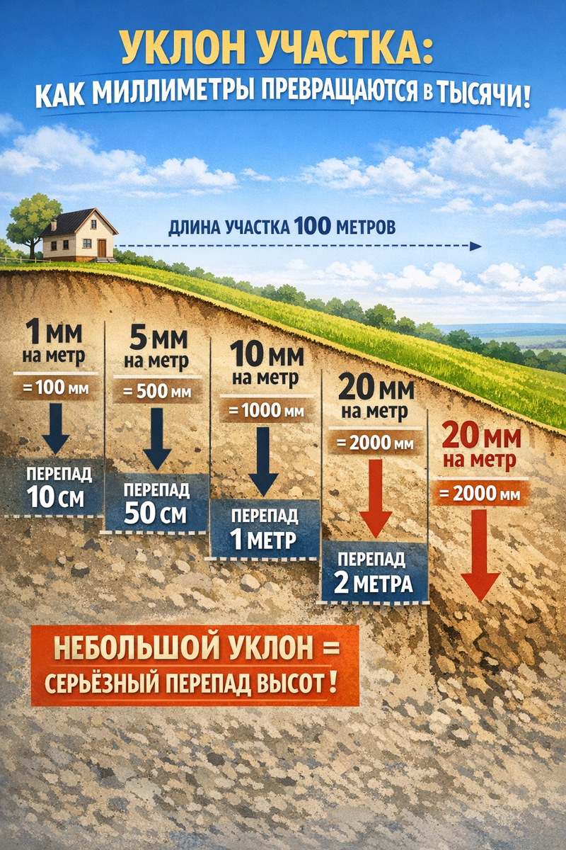 А на длине участка — превращается в серьёзную разницу по высоте. Например: