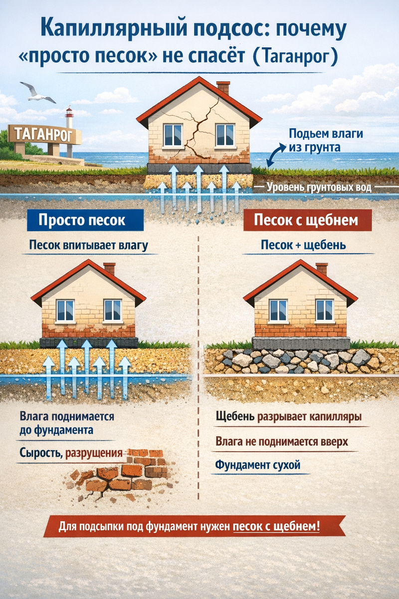 В песке поры крупнее — вода поднимается хуже, но это не значит, что её не будет вообще. И вот ключ: если снизу есть влажный грунт, влага из грунта в дом может идти даже без луж и без видимой воды. Через капилляры, медленно, но стабильно. Песок, положенный п
