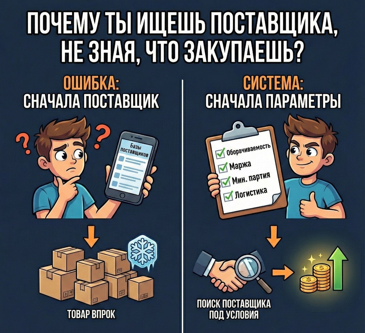 ? Большинство начинают с вопроса: «Где найти поставщика для маркетплейса?» Открывают базы. Листают Alibaba. Спрашивают в чатах. Находят контакт. Договариваются. Закупаются. Через месяц сидят на складе с товаром, который не продаётся. — Проблема не в поставщике. Проблема в том, что ты не знал, "что именно" закупаешь. Не цену. Не товар. А "набор параметров", которые либо впишутся в твою модель, либо нет. Оборачиваемость. Маржа. Минимальная партия. Логистика. Без этого даже «хороший поставщик» не спасёт. — Пример: Товар А: закупка 500₽, минимум 100 шт = 50 000₽ вложений Товар Б: закупка 450₽, минимум 500 шт = 225 000₽ вложений Товар Б дешевле. Но если ниша не выстрелит — ты застрял с четвертью миллиона в товаре на полгода. Товар А можно протестировать за месяц и выйти, если не зашло. Дешевле ≠ выгоднее. — Поиск поставщика — это не первый шаг. Это последний. Сначала ты должен понять: ▪️ Какую минимальную партию потянешь ▪️ Какая маржа критична ▪️ Какая оборачиваемость те