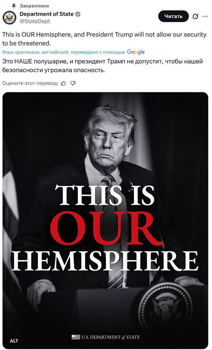⚡️«Это наше полушарие»: Госдеп США официально объявил западной полушарие «своим