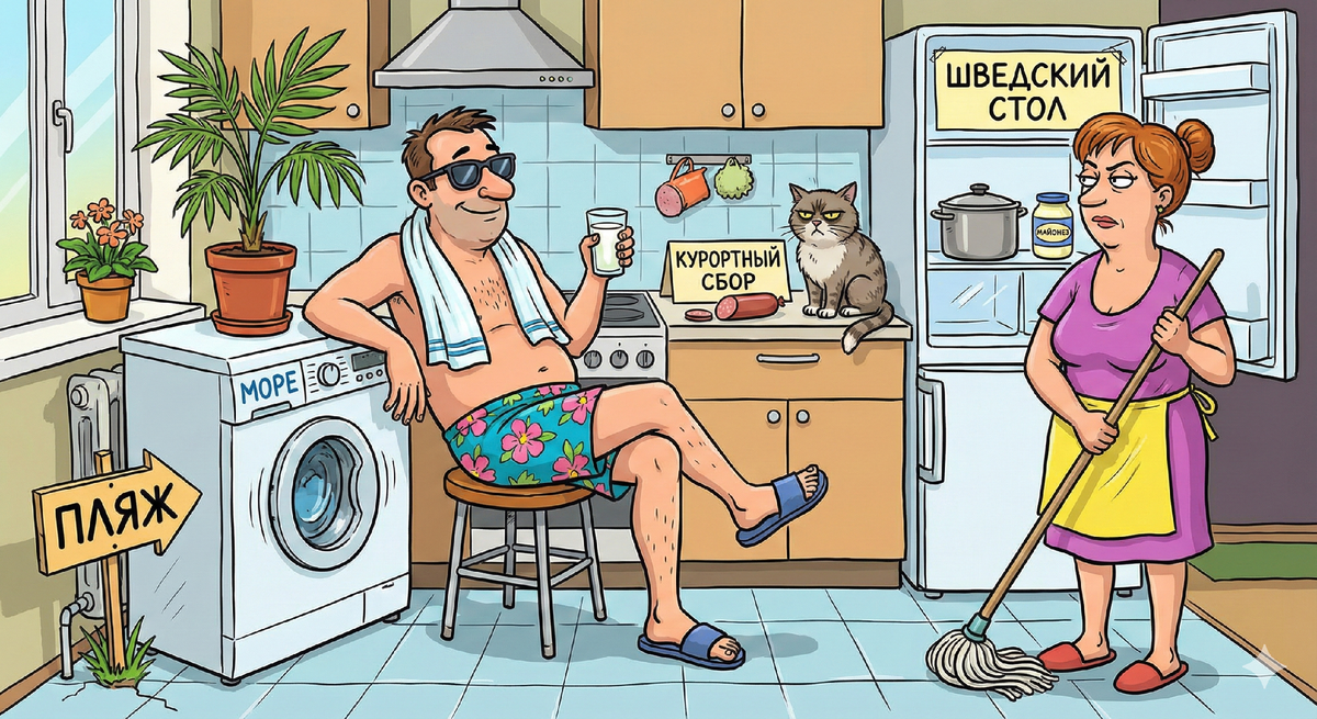 Открыл я вчера сайт с путевками и тут же закрыл. Резко так закрыл, чтобы монитор не треснул от стыда за такие цифры. Оказалось, граждане, что мой годовой бюджет на отдых позволяет мне доехать только до соседней улицы. И то, если я буду идти пешком, а чемодан покачу сам. Супруга моя, женщина мечтательная, говорит: хочу, мол, смены обстановки и плеска волн. А я ей отвечаю категорически. Обстановка, говорю, у нас и так меняется. Вчера стул стоял у окна, сегодня я его передвинул к столу. Вот тебе и новая геолокация. А насчет волн - так это мы сейчас организуем. Решил я не унывать. Человек я технически подкованный, с фантазией. Объявил дома режим "всё включено". Надел плавки, на шею повесил полотенце. Супруга посмотрела на меня с подозрением, но промолчала. Видимо, решила, что это акклиматизация. Начал я свое путешествие из спальни. Это у нас был номер "Люкс" с видом на шкаф. Погода в номере стояла отличная, двадцать градусов тепла, влажность умеренная, если цветы не поливать. Взял я в руку
