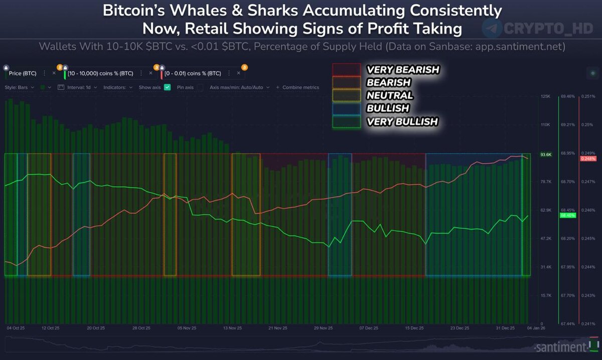 🐃 Аналитики Santiment ожидают роста крипторынка в ближайшее время – киты накапливают BTC, а розница (толпа) фиксирует прибыль. С 17 декабря киты и акулы купили 56,227 BTC ($5,2b), а мелкие трейдеры начали фиксировать профит последний сутки. Crypto Headlines