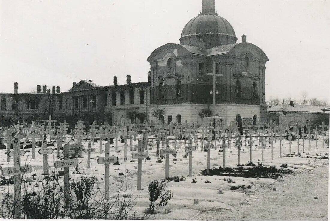 На центральной площади, перед путевым дворцом Екатерины Великой они устроили кладбище. Моя бабушка по материнской линии Мария Ивановна(1902-75) с тётей Ниной (1928-88) уходила из города перед приходом врага. В детстве она мне несколько раз рассказывала, что выкапывала трупы немцев на площади. И вот два года назад я нашёл в сети редкое фото. Группа жителей города на "субботнике". Бабушка третья справа. Жуть. Фашистов хоронили без гробов. В одеялах и других тряпках. Та ещё работёнка.