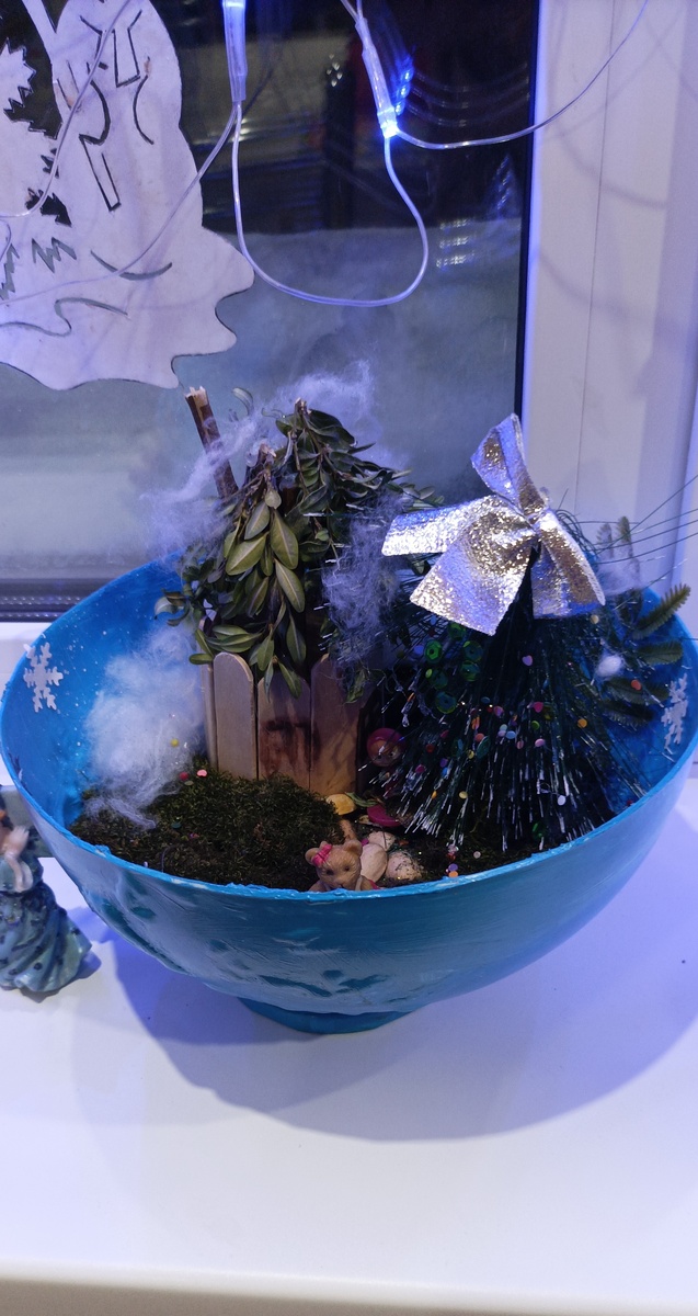 Вот этот домик, например, Дим Димыч там делал несколько дней. Зато всё полностью сам). Сначала красил вот эту вот основу в голубой, насыпал землю туда, сам домик склеивал, выкладывал дорожки кожурой от фисташек, крышу крепил, ёлку, снег.