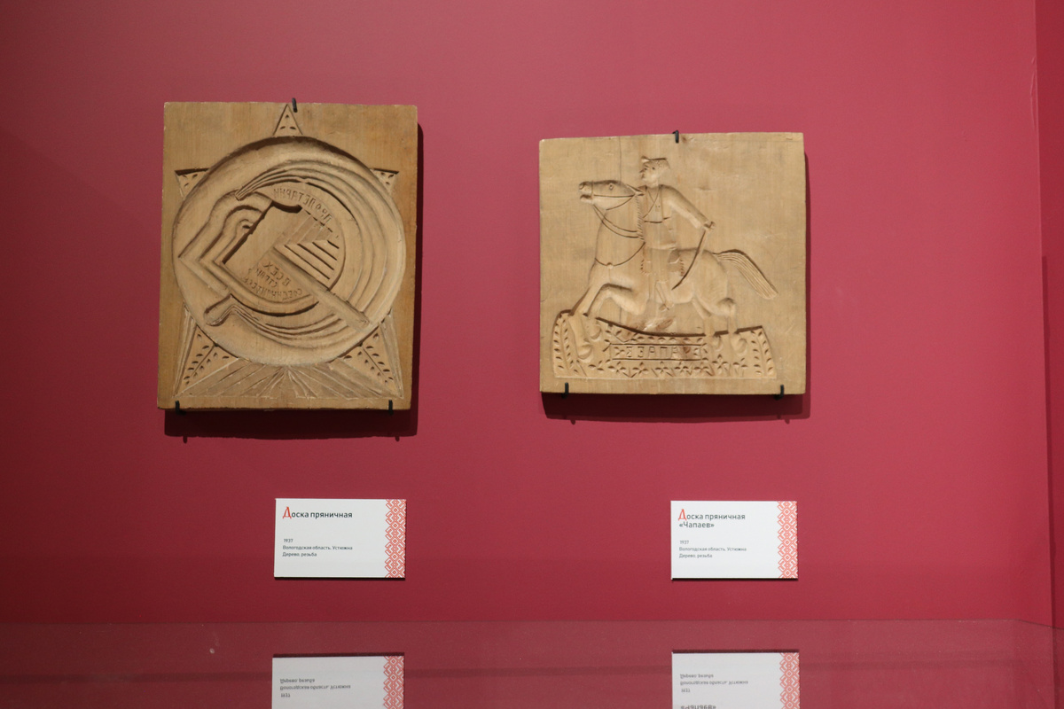 Изучая экспонаты на выставке «Русская традиция», приехавшей к нам из питерского Русского музея натолкнулся на прекрасное! Две пряничные доски из города Устюжна Вологодской области образца 1937 года! Оказывается, в Устюжне как и в Туле или в Покрове делали печатные пряники и, судя по пряничным доскам, в 1937 году эти пряники в местных артелях еще делали, а потом перестали – перешли к поточно-фабричному производству «как все» по общем для всего Советского союза технологическим картам, позволявшим получать отличные пряники, у которых была всего одна проблема – они почему-то всегда продавались в состоянии, близком к черствому. Сейчас местное начальство обсуждает как бы «возродить» «изучить» и «реконструировать» устюженский пряник, чтобы развивать местный туризм. Хотя чего там «возрождать» - рецепт устюженских пряников вполне доступен после легкого поиска в этом вашем интернете. Но это я отвлекся от прекрасных пряничных досок! Так вот на одной из них изображен серп и молот со звездой и надп