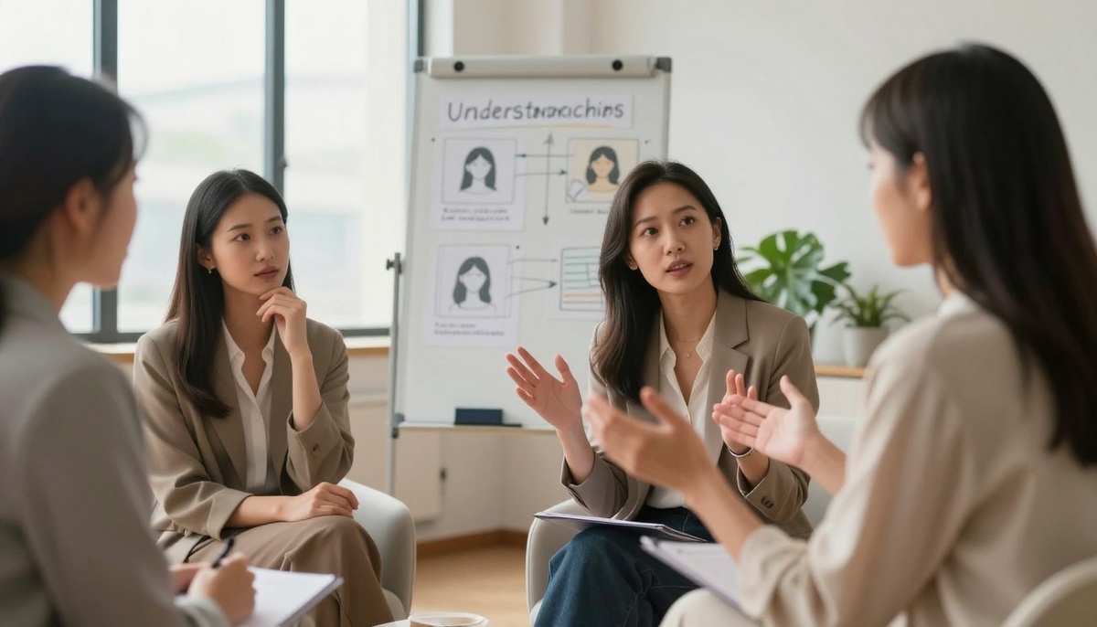 Вдумчивое и безмятежное изображение понимания женской психологии, изображающее разношерстную группу женщин, беседующих в уютной, мягко освещенной обстановке кафе. На переднем плане женщина с длинными волнистыми волосами в профессиональном костюме делится своей точкой зрения, в то время как в центре женщина с вьющимися волосами задумчиво кивает, а другая женщина с прямыми волосами внимательно слушает. Атмосфера теплая и располагающая, освещенная мягким золотистым светом, который создает нежные тени, усиливая эмоциональную глубину сцены. На заднем плане полки, заполненные книгами по психологии и взаимоотношениям, намекают на тему понимания. Используйте объектив с углом обзора 50 мм для создания естественной перспективы, фокусируясь на выражениях и эмоциях объектов съемки, чтобы передать ощущение самоанализа и связи.