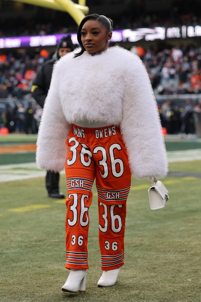 28-летняя олимпийская гимнастка поддержала своего мужа Джонатана Оуэнса на последнем матче регулярного сезона "Чикаго Беарз" против "Детройт Лайонс". Она появилась на стадионе "Солджер Филд" в индивидуальном наряде, посвященном Оуэнсу. Байлз носила ярко-оранжевые штаны с именем и номером Оуэнса, а также вуаль и ботинки. Несмотря на ее стильную поддержку, "Беарз" проиграли "Лайонс" со счетом 19-16. Что вы думаете, помогут ли стильные наряды Байлз ее мужу в предстоящих плей-офф?