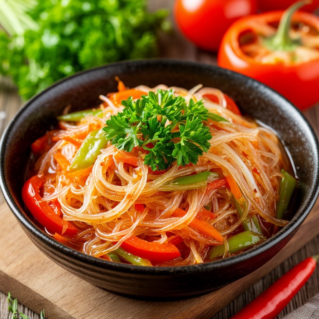 Фунчоза — это стеклянная лапша, которая быстро готовится и отлично впитывает вкусы соусов и овощей. Она не даёт ощущения тяжести, поэтому блюдо получается одновременно лёгким и сытным.