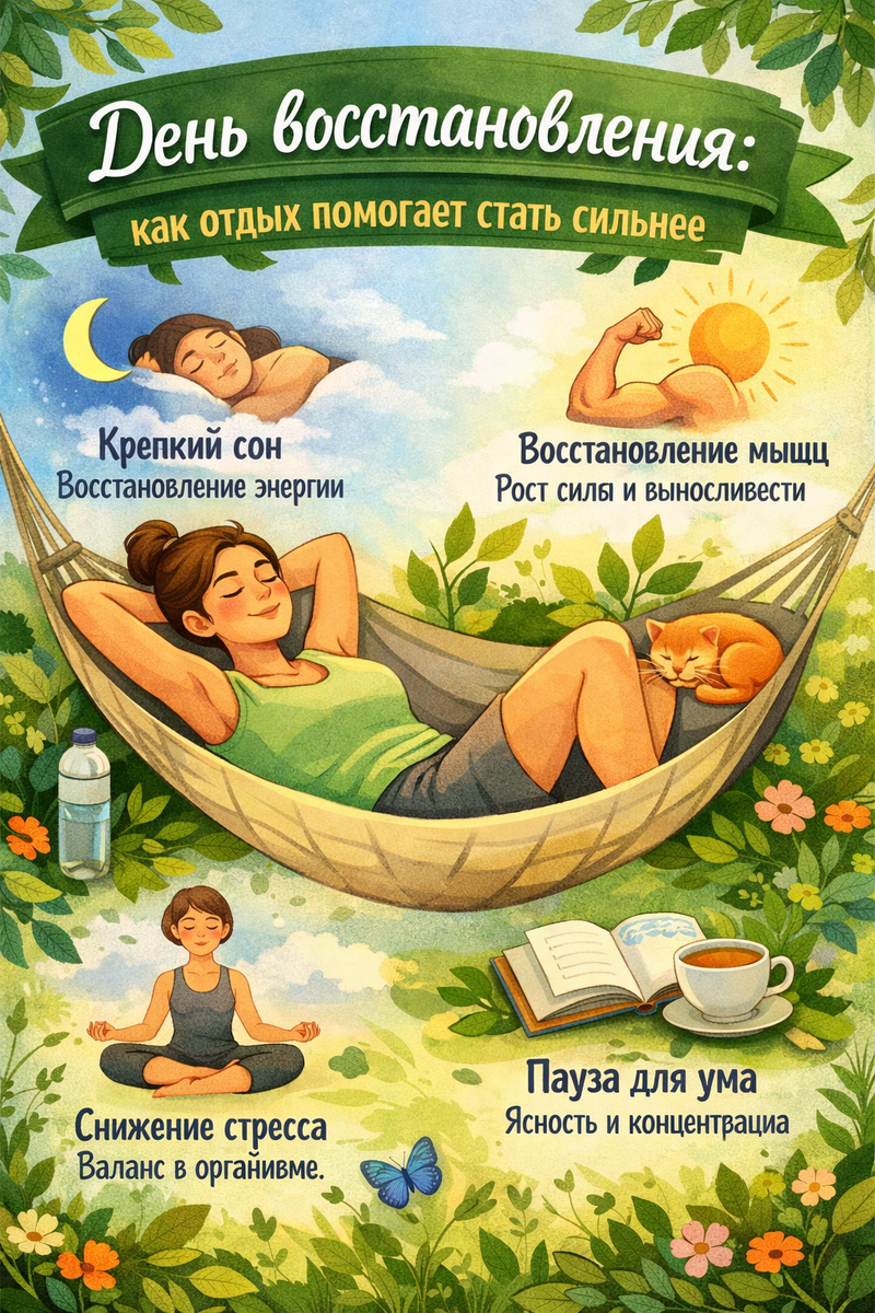 Поэтому день отдыха — не слабость, а обязательная часть движения вперёд. Когда мы тренируемся, мышцы получают микроповреждения.