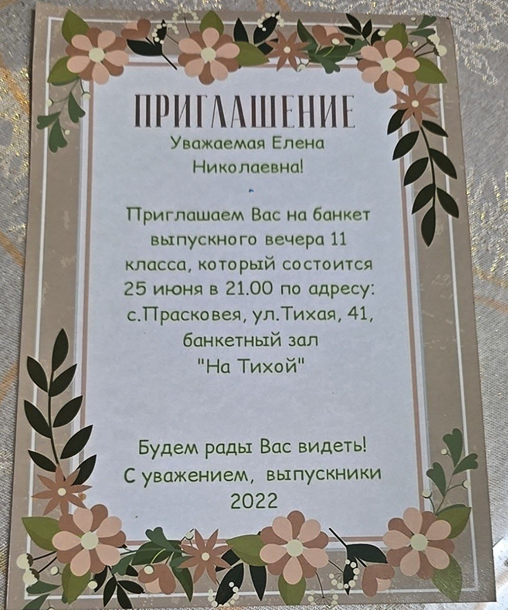 ). Нашла вот это приглашение. Я помню этот класс, их выпускной - это приятное воспоминание и немного грустное (таких, как они, уже не будет). Это был читающий класс (ох уж мы и подискутировали на уроках литературы, когда изучали "Грозу", "Отцов и детей", "Войну и мир", "Преступление и наказание"), это был целеустремленный класс. И я не просто верю, а знаю, что они станут высококвалифицированными специалистами.