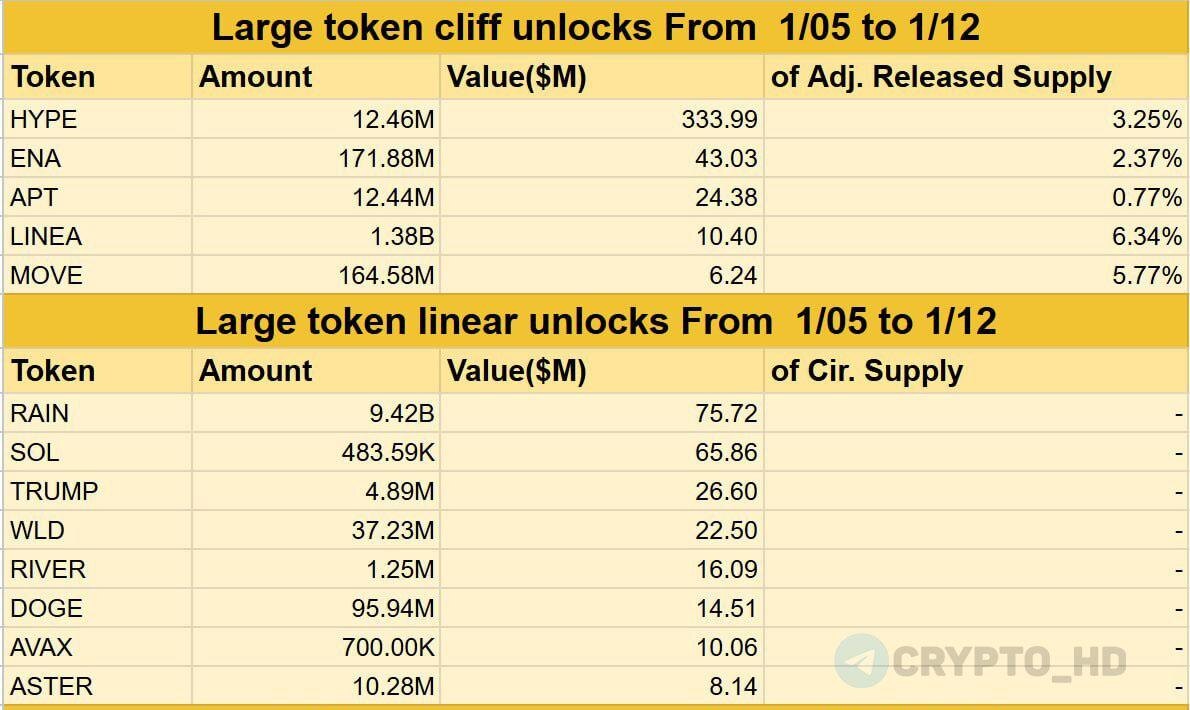 🔓 ТОП разблокировок токенов с 5 по 12 января! Cliff Unlocks: ▫️#HYPE - $333,99m ▫️#ENA - $43,03m ▫️#APT - $24,38m ▫️#LINEA - $10,40m ▫️#MOVE - $6,24m Linear Unlocks: ▫️#RAIN - $75,72m ▫️#SOL - $65,86m ▫️#TRUMP - $26,60m ▫️#WLD - $22,50m ▫️#RIVER - $16,09m ▫️#DOGE - $14,51m ▫️#AVAX - $10,06m ▫️#ASTER - $8,14m P.S. Cliff Unlocks – разблокировка крупной порции токенов единовременно в конкретную дату. Linear Unlocks – постепенная разблокировка токенов в течение определенного периода (обычно каждый день или каждую неделю по части). Crypto Headlines