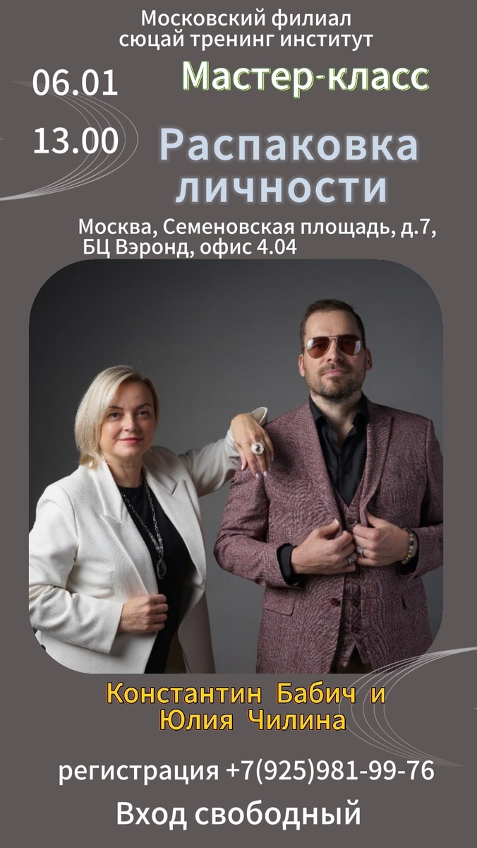 6 ЯНВАРЯ / ОТКРЫТЫЙ МАСТЕР-КЛАСС СЮЦАЙ 🔴 🚀 РАСПАКОВКА ЛИЧНОСТИ ОТКРОЙ СИЛУ МЕТОДА, МЕНЯЮЩЕГО РЕАЛЬНОСТЬ 🕒 13:00 – 15:00 ✨ ЧТО ВАС ЖДЁТ: 🔹 Практичные инструменты для прорыва в личностном росте и бизнесе. 🔹 Глубокий анализ жизненных и бизнес-задач через призму науки Сюцай. 🔹 Распаковка личности: узнайте свои скрытые ресурсы. 🔹 Коммуникации, которые работают — в семье, карьере, бизнесе. 🎯 СПИКЕРЫ ✅ Юлия Чилина и Константин Бабич ✅ 7 лет успешной практики метода Сюцай ✅ Эксперты в трансформации сознания, бизнес-решений и отношений 📍 АДРЕС: Московский офис Сюцай Тренинг Института Москва, (м. Семёновская) , Семёновская площадь, д., 7, деловой центр Вэронд, 4 этаж, офис 4.04 Мы на Яндекс картах 👇 https://yandex.ru/maps/org/syutsay_trening_institut/131024568245 📞 РЕГИСТРАЦИЯ ОБЯЗАТЕЛЬНА: +79259819976 (Юлия) 🎁 ВХОД СВОБОДНЫЙ ⏳ Успейте зарегистрироваться — начните новый год с трансформации! 6 января, 13:00. Только для тех, кто готов меняться.