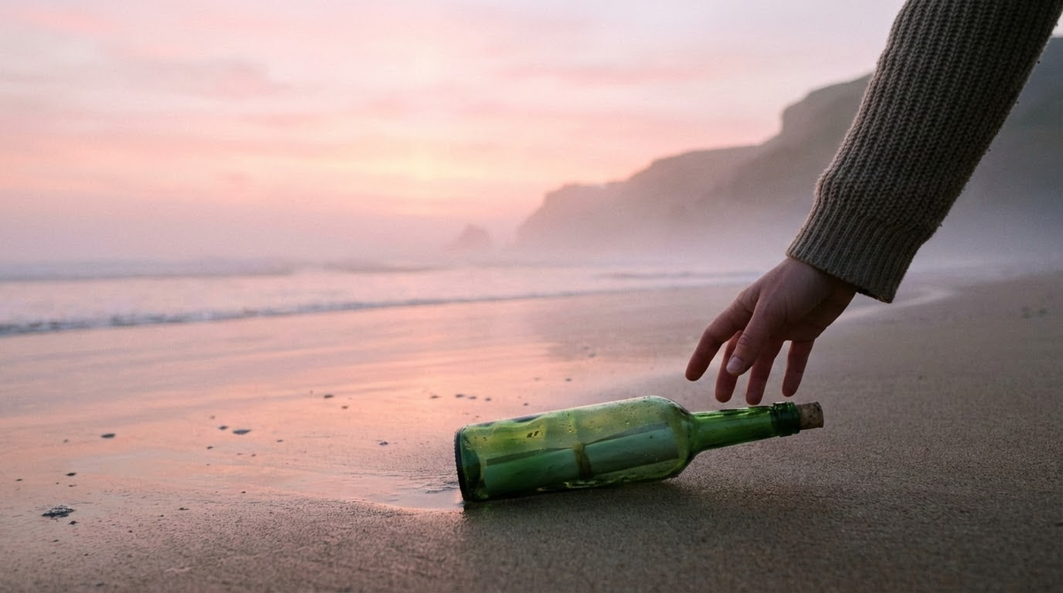 Бутылка лежала у самой кромки воды. Зелёное стекло поблёскивало в розовом свете раннего утра, и я сначала приняла её за кусок морского мусора.