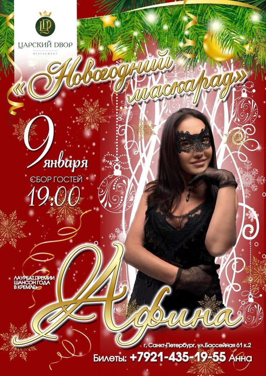 Студия «Ночное такси» приглашает! 9 января! Новогодний маскарад с Афиной! Санкт-Петербург! Ресторан «Царский Двор»!!! Ваши любимые хиты в исполнении неподражаемой Афины, веселье, танцы, сюрпризы, общение, праздничная программа!!! Сбор гостей в 19.00. Билеты по тел. + 7(921) 435-19-55