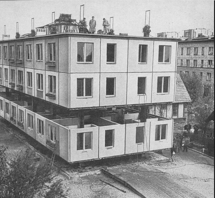 Метод подъема этажей позволял отказаться от привычных строительных кранов. Вначале были установлены два ряда колонн - несущих свай, после чего тяжёлыми строительными домкратами подняли и зафиксировали крышу. На сплошной железобетонной плите толщиной 16 см, с вырезом для одномаршевой лестницы, был полностью собран из панелей верхний этаж. Затем с помощью домкратов он был так же поднят наверх и закреплен. Аналогичным образом собрали и подняли остальные этажи.